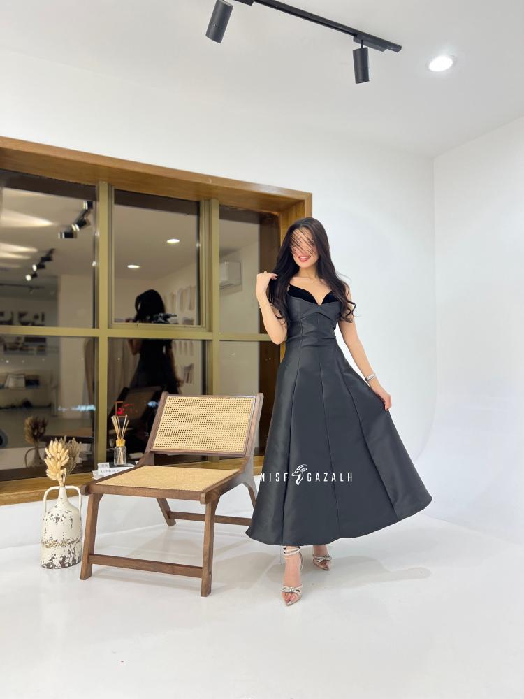 فستان سهرة اسود ميكادو يتم تصنيع وتصميم الفساتين الخاص بنا من قبل المصممين والخياطين الخاصين بنا.