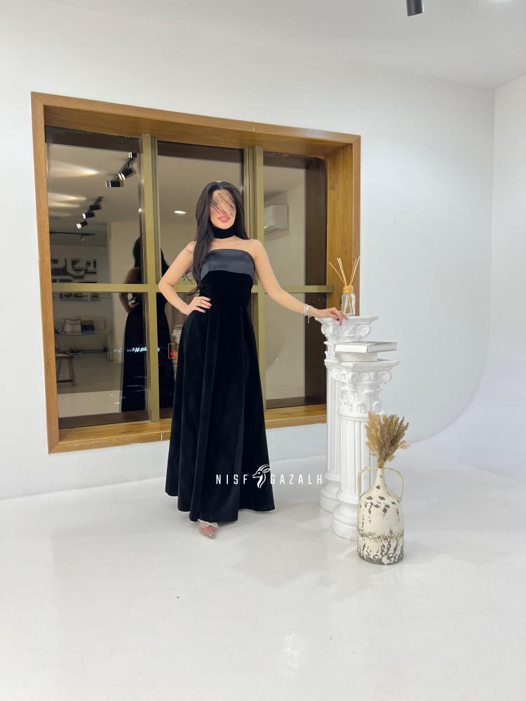 فستان ناعم تفته من عند الصدر صنع بخامة جوخ اسود وتم قص وتفصيل المقاسات على وحدات القياس المعتمدة من شركتنا وتم ارفاق نموذج القياس في وصف المنتج.